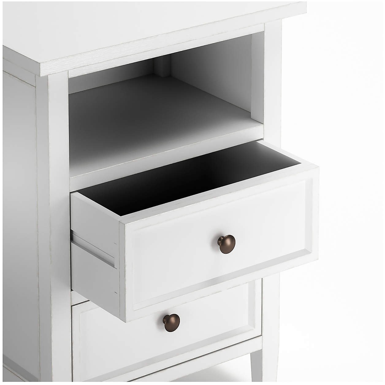 Our relaxed-modern bedroom collection brings to mind the easy joys of a day at the beach. In order to achieve the warm white surface and vintage look of the nightstand, an intricate procedure of hand painting and hand distressing was used. Knobs made of antique brass add to its attractiveness.Features:Two slide-out drawersSupple, metal-alloy roller slidesStylishly profiled topFor every bedroom or living room, perfectAvailable in many sizes and huesDimensions:Dimensions (overall): 80cm H x 60cm W x 40cm DNote:Color variations may occur due to color combinations displayed on the monitor/screen. To confirm the product, you can visit our store or browse our catalog.