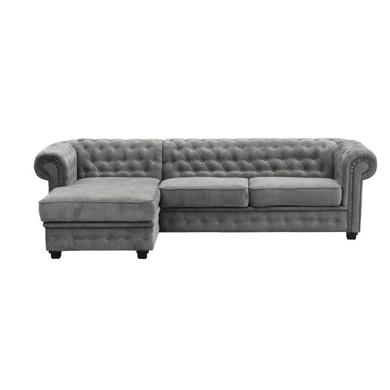This roomy corner couch looks great in both traditional and modern settings, and it can comfortably seat four people. It features rolling arms with button-tufted accents, a high back, and a sophisticated L shape. This couch has velvety cushioning, sinuous springs, and soft woven fabric.Features:Buttoned backs and armsProduced in high-quality and durable fabricSofa is 67cm high without the legs.The cushions are not washableLeg Material: Solid WoodUpholstery Material: Polyester BlendDimensions:Overall: 75cm H x 270cm W x 155cm DNote:Color variations may occur due to color combinations displayed on the monitor/screen. To confirm the product, you can visit our store or browse our catalog.