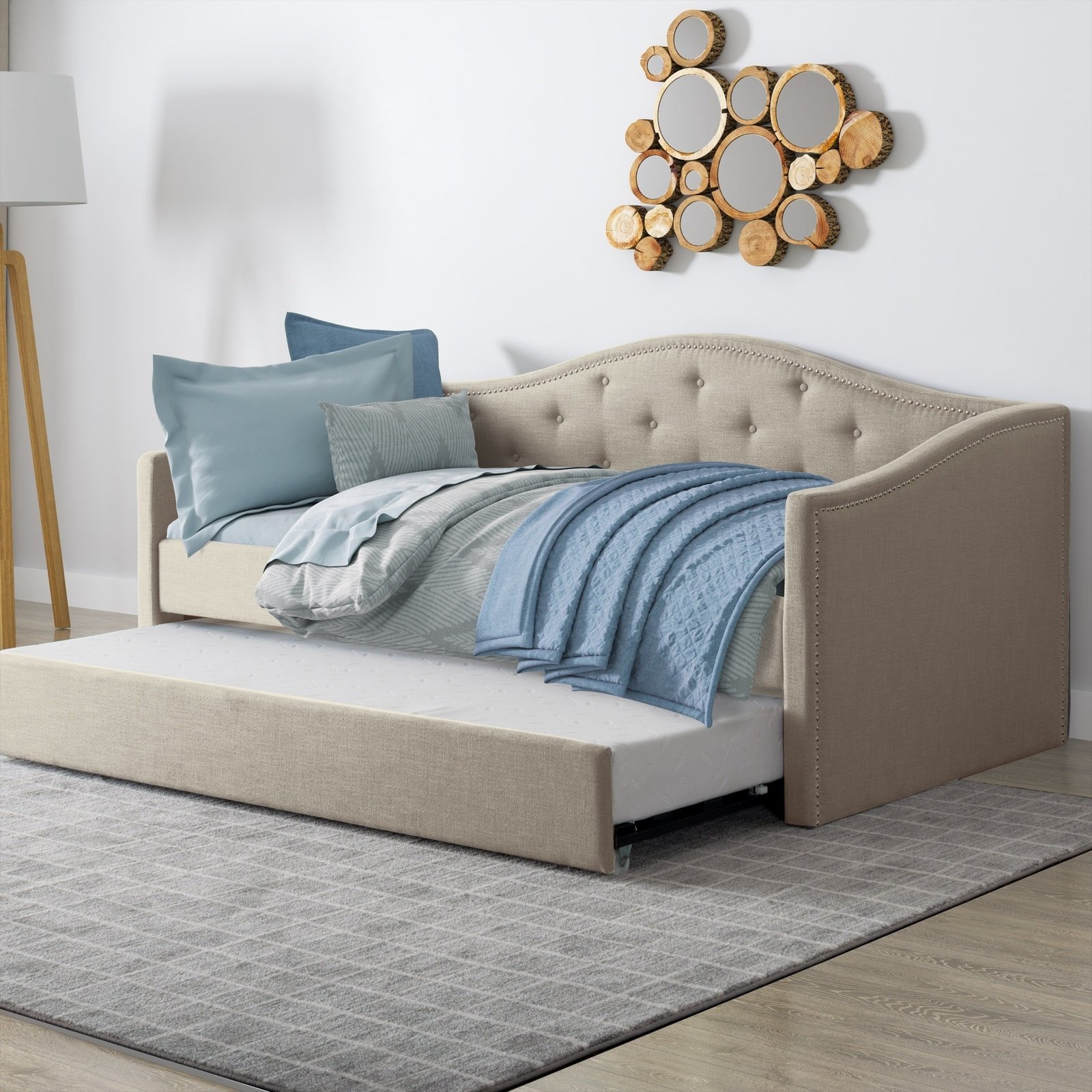With this lovely daybed and trundle combination, you can comfortably host overnight visitors. This daybed gives your home a timeless appearance with its traditional form, tufted backboard, and nailhead trim. To create a cozy sleeping space for overnight visitors or family, pull out the trundle.Features:Wood and metal constructionDaybed and trundle bed designsHandcrafted detailing on the arch topAccent nail head trimSpecialized concealed trundle with stoppersAccommodates a typical twin or single-sized mattressDimensions:Mattress: 200cm L x 100cm W x 15 (Optional)Dimensions (overall): 220cm L x 110cm W x 110cm HTrundle Mattress: 190cm x 90cm x 15Note:Color variations may occur due to color combinations displayed on the monitor/screen. To confirm the product, you can visit our store or browse our catalog.