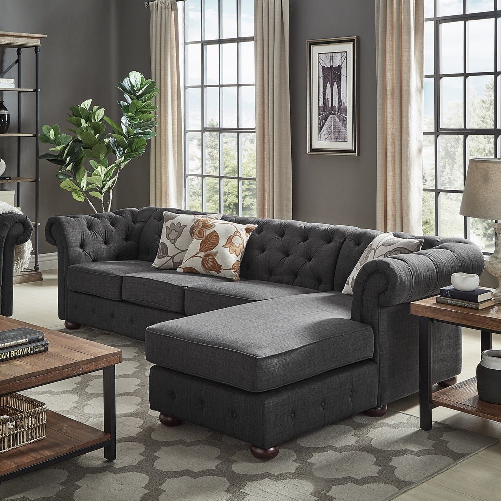 Comfort’s four-seat couch and chaise allow you to furnish your living area with plush seating. Button tufting on the low, rolling back, and arms gives the design a hint of traditional refinement. Either facing left or right, the chaise is perfect for unwinding with a book or a TV show. Upholstery made of linen is available in beige, grey, or dark grey. Arms and backs were tufted and rolled.Features:Comfy cushions that are medium-firmEspresso-finished bun feet.MDF plywood, fabric, rubberwood, and foam construction materialsEach seat was tested to support up to 250 pounds.Beige, dark grey, or grey upholstery.The couch has four seats and a chaise on the left side.Simple to maintain and tidy.Offered in an array of colors and sizesAssembly Required.Upholstery; fabricDimensions:Dimensions (overall): 285cm W x 170cm D x 85cm HNote:Color variations may occur due to color combinations displayed on the monitor/screen. To confirm the product, you can visit our store or browse our catalog.
