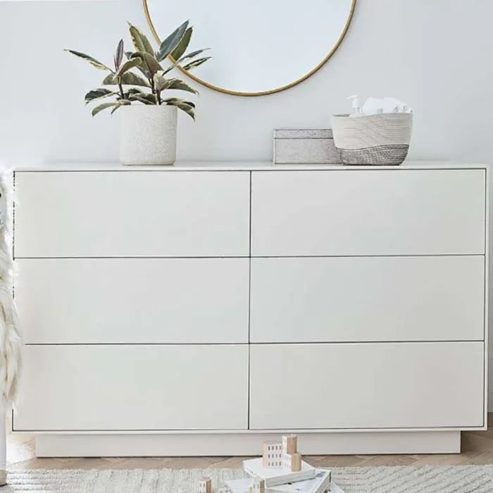 The Emilia Dresser is the ideal accent to a contemporary, minimalist space. It organizes clothing, toys, and more in a timeless white with a simple design.Features:Traditional mid-century modern styleIncluding six drawersEco-friendly materials; MDF wood;Ideal for any bedroomDust frequently with a gentle, dry cloth.Keep away from the sun’s rays and chilly temperatures.Dimensions:Dimensions (overall): 145cm W, 45cm D, 85cm HNote:Color variations may occur due to color combinations displayed on the monitor/screen. To confirm the product, you can visit our store or browse our catalog.