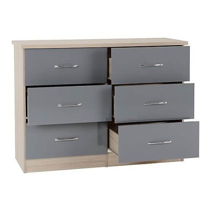 The gloss finished front of the Grey 6 Drawer Chest, which contrasts beautifully with the light wood veneers, gives it