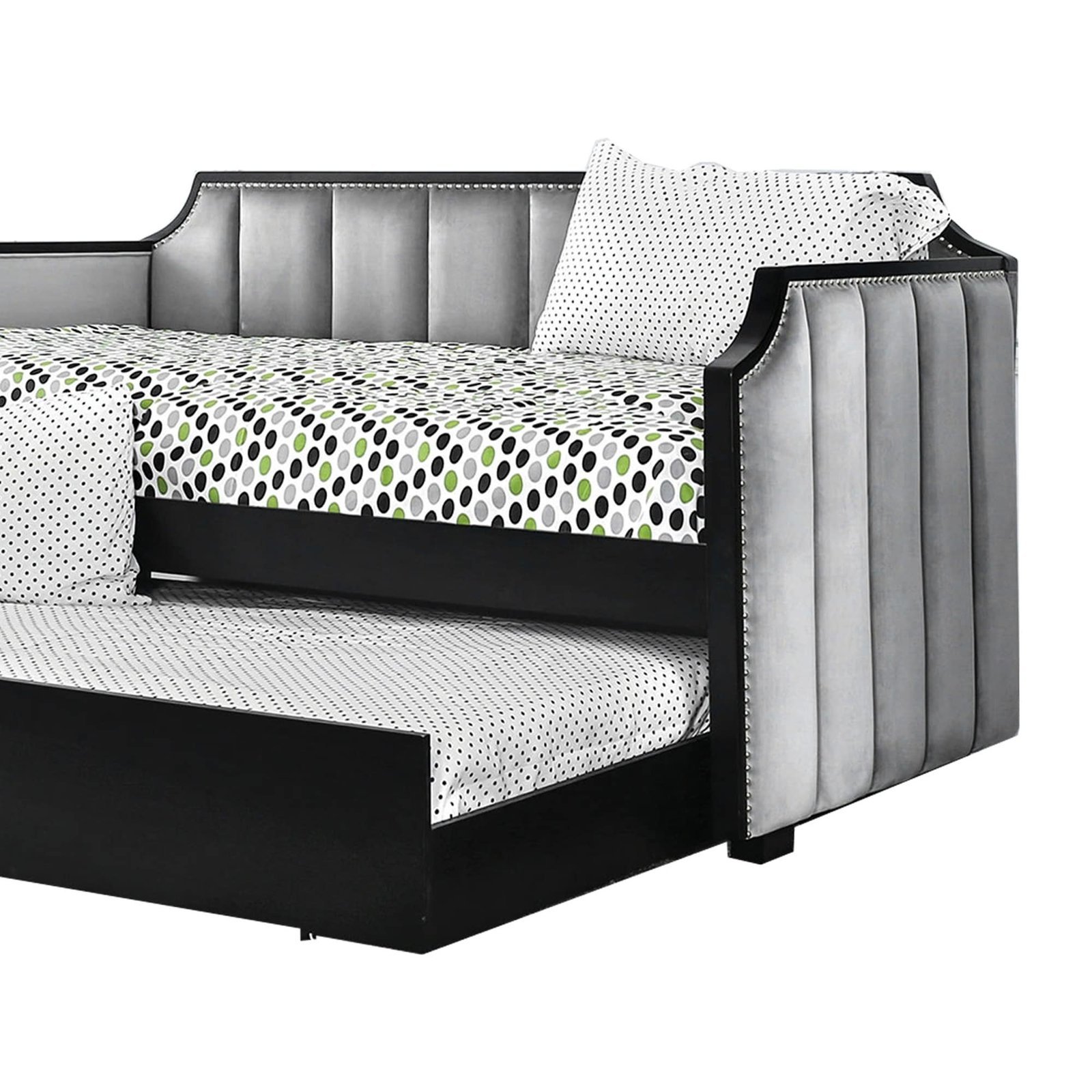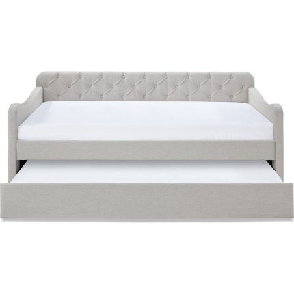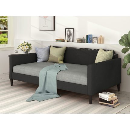 With this modern-style wooden daybed, your living space will appear absolutely stunning. It has gray cloth upholstery with vertical tufting accents and nail head trim around the edges. It is supported by block legs.FeaturesA single Daybed unitCloth upholstered in a gray huePerformance fabric for the upholstery Vertical channel tufting for the product Customized nail head trim componentsSupport legs made with blocksDisplays a modern aestheticDimensions:Mattress: 200cm L x 100cm W 15 (Optional)Dimensions (overall): 220cm L x 115cm W x 95cm HTrundle Mattress; 190cm x 90cm x 15Note:Color variations may occur due to color combinations displayed on the monitor/screen. To confirm the product, you can visit our store or browse our catalog.