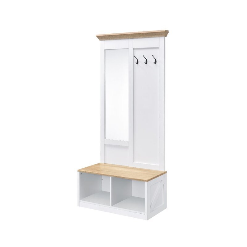 The hall tree’s open frame and simple lines, which were inspired by modern line art, add to the room’s fashionable vibe. Its Body Length Mirror and Bench finish brilliantly display your collections, and a Light Oak & White finish beautifully matches the Wood frame. 3 Metal Hooks and 2 Open Compartments provide you the chance to show off your unique sense of style.Features:Design; VerticalMaterial; MDFFinishing; WhiteMany hooks for clothingVariously shaped drawers and cabinetsAvailable in a variety of patterns and huesDimensions:Dimensions : 185cm H x 88cm W x 45cm DNote:Color variations may occur due to color combinations displayed on the monitor/screen. To confirm the product, you can visit our store or browse our catalog.