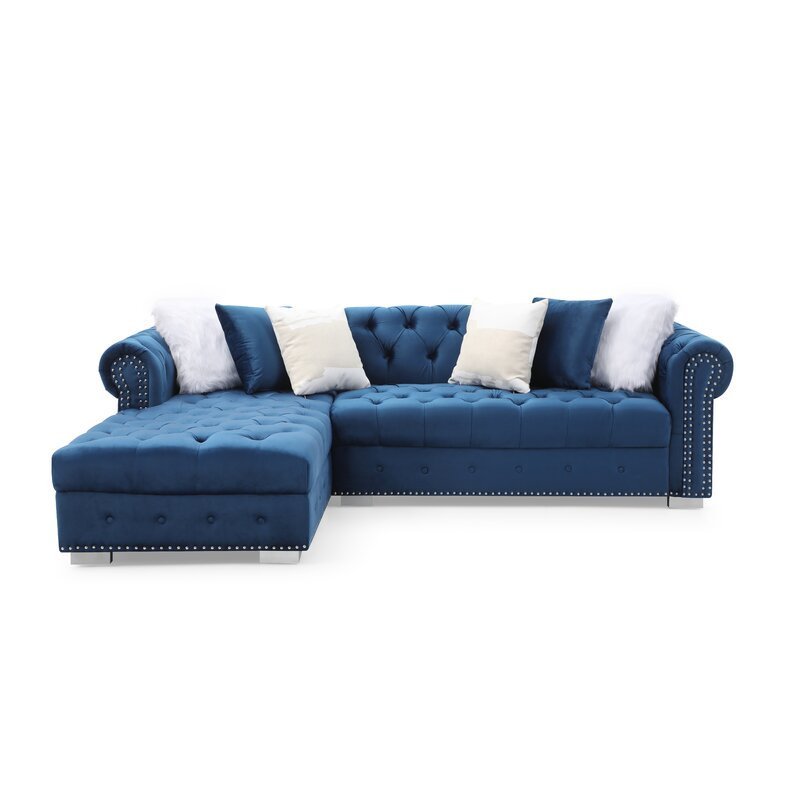 This sofa and chaise form a stylish focal point in your living room. Its traditional silhouette and bold accents set it apart. The chesterfield shape is made of engineered wood and features rolled arms and wooden feet. It has velvet upholstery, which adds a luxurious touch. The arm fronts are accented with button tufting and nailhead trim.Features:Sectional sofa in 2-pieces with double chaiseAccent back cushions includedFoam-filled seatsSolid wooden feetDimensions:Overall Dimensions: 245 cm Wx 170 cm D x 85 cm HSeating Height : 45cmSeating Depth : 65cmBackrest Height : 40cmArm Thickness : 25cmLegs Height: 8cmNote:Color variations may occur due to color combinations displayed on the monitor/screen. To confirm the product, you can visit our store and browse our catalog.