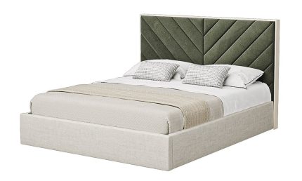 This bed frame is covered in fabric from the base to the incredibly tall headboard. A luxurious design exudes refinement