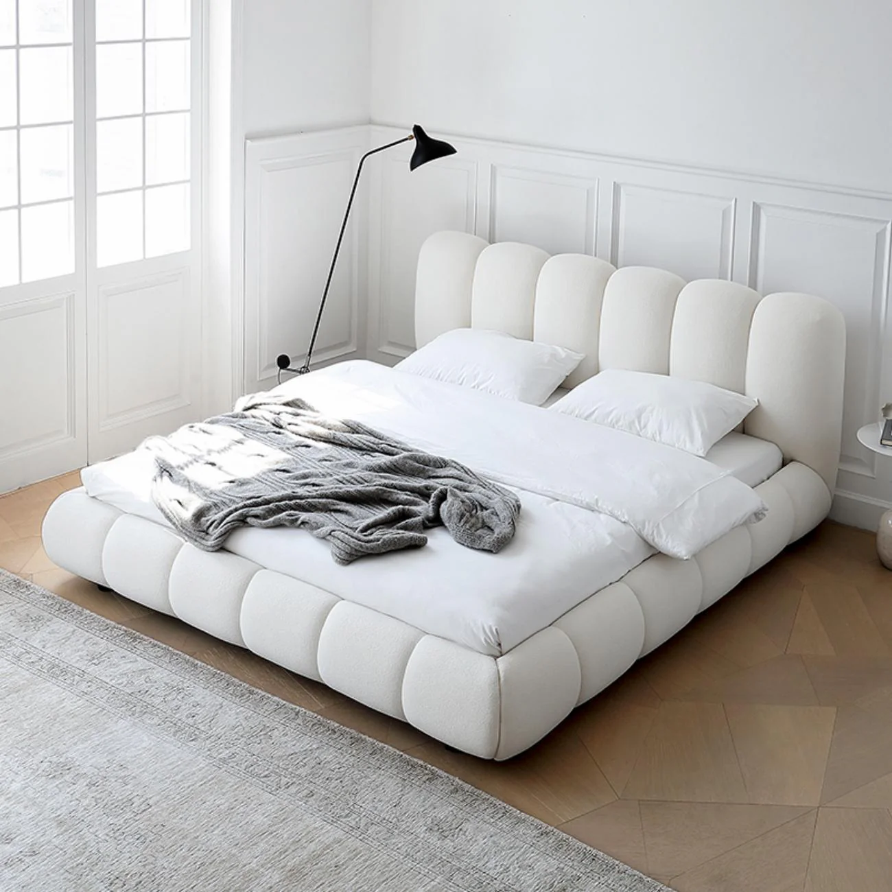 This bed frame is covered in fabric from the base to the incredibly tall headboard. A luxurious design exudes refinement