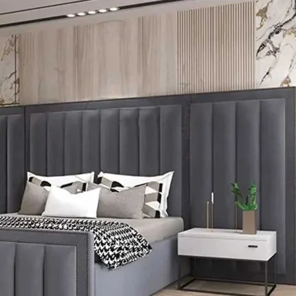 In your warm, modern bedroom, add more storage with a grey upholstered storage bed. Grey cloth covers the cushioned wood