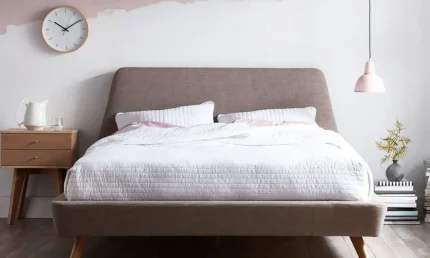 This Land Farm Upholstered bed, the ideal center of attention for any bedroom, creates the ideal setting in mid-century contemporary