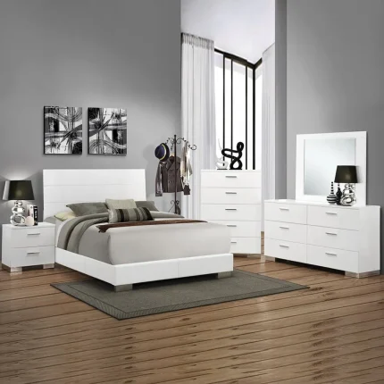 This line offers a white polyurethane coating polished to a high gloss finish, with beautiful modern design. The headboard of