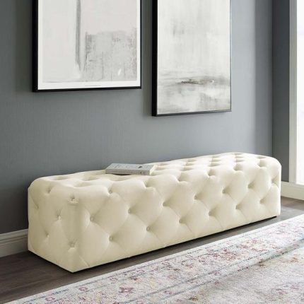 This velvet entrance bench with tufted buttons has thick foam cushioning and soft, durable performance velvet upholstery for a plush